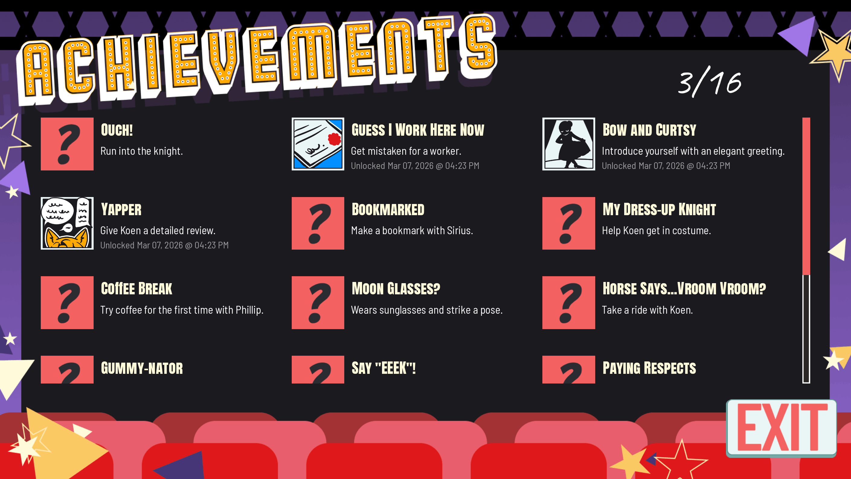 played thru the demo once and rlly enjoyed it, the art style is really pretty and the bg music is really nice too, i had it running in the background for a bit and was j vibing to it and lwk forgot it was acc from a game LOL. i also love the aesthetic of the ui. i liked all the characters including mc, the demo does v well at letting u get a nice, solid first impression! the acting scene w koen def made him grow on me<3 anywho, the premise for the game is v interesting and im excited to see where it goes!!