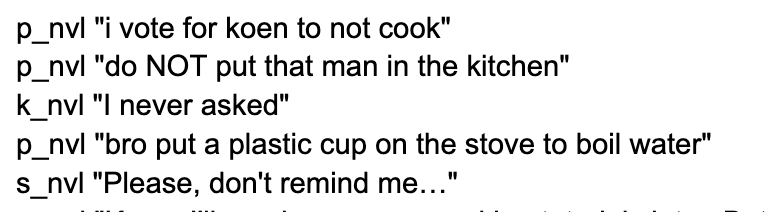 I'm feeling a tad bit nefarious, so I'm exposing Koen being a safety hazard in the kitchen.