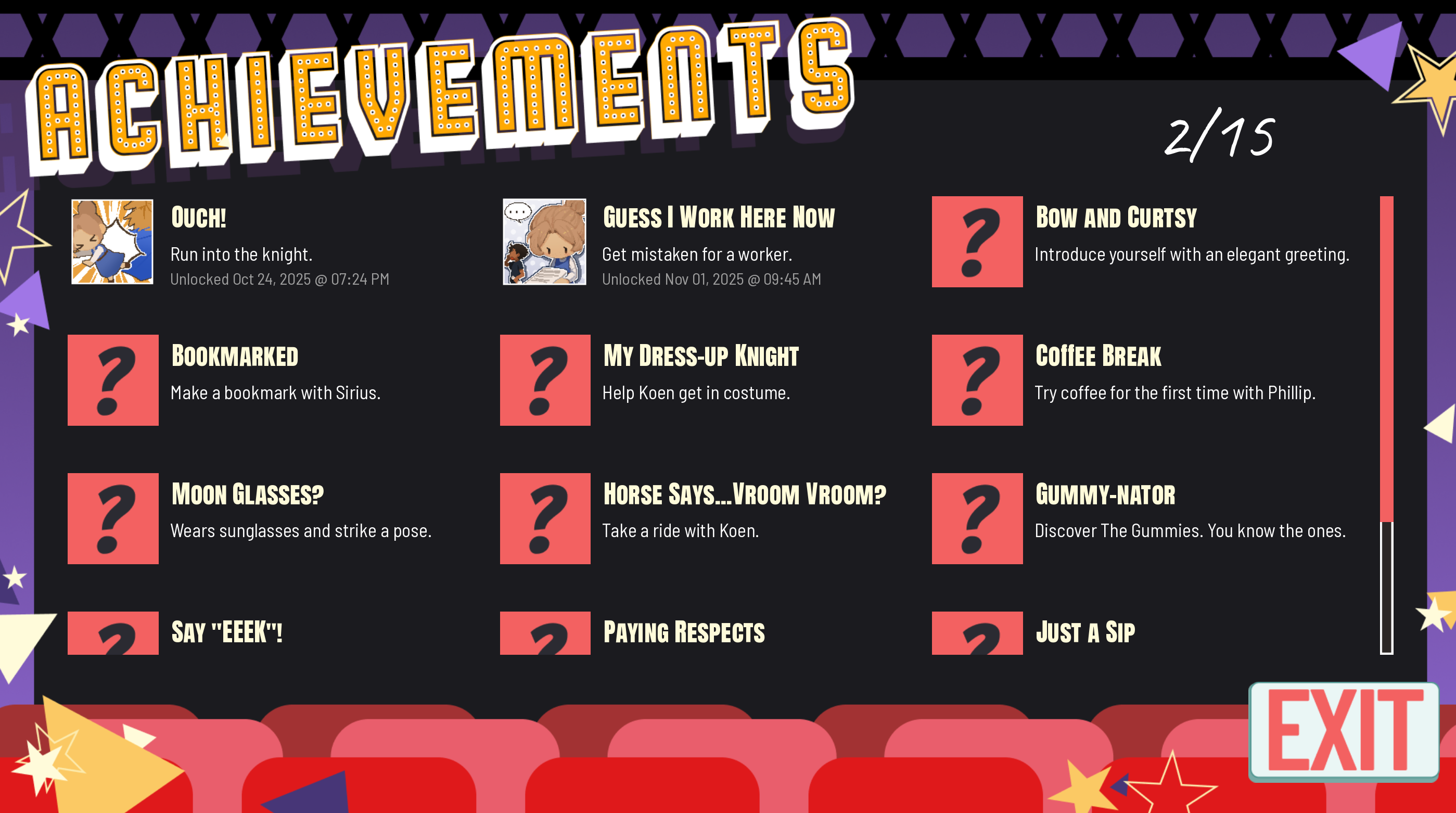 I implemented a handy-dandy achievement system. Each achievement comes with cute art (some of which is done by a dear friend of mine), so hopefully it will encourage you guys to see everything my story has to offer.
