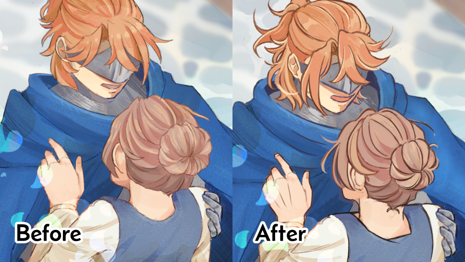 Lastly, I made good headway in the art department. I redesigned a character (that has yet to receive a sprite in the current build) and am working on her sprite now. I also started the first CG and background art, along with completing the episode intro card. (You can check out the intro card on our twitter/X, hint hint.) It's been a while since Take Two came out, so the urge to redraw stuff is growing stronger every day, but obviously that's very time-consuming. So instead, I met myself in the middle and touched up on all the LI's intro CGs! Here's a look at Koen's: