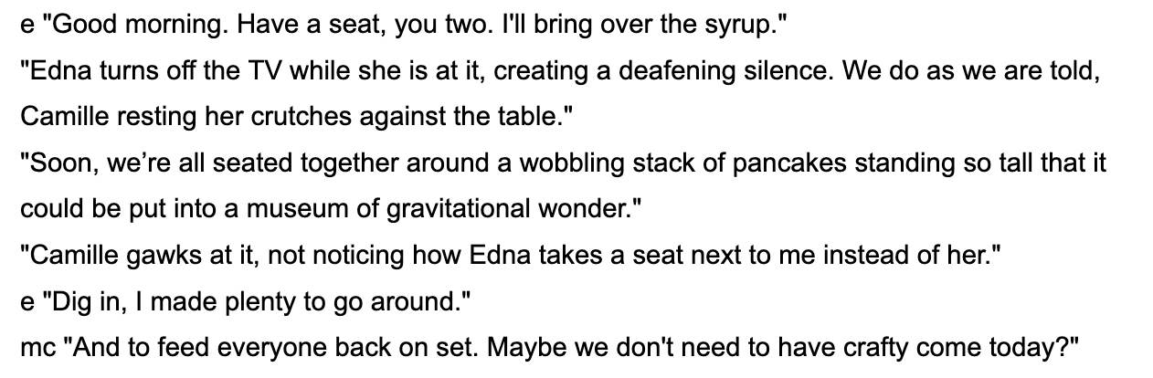 In November, the editors have finished thoroughly combing through the script. I've gone over roughly 70% of the edits. So close to the finish line! But once the script is finalized... It's time to program it in. That's a whole beast in itself. While I wrestle with that, here's a small preview featuring breakfast with the Hale family.