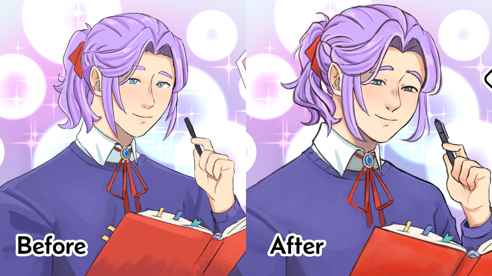 Art has slowed down again because I was focused on writing. I was still able to touch up a few older CGs still! I'm pretty proud of how Sirius' intro CG turned out. His expression is a lot closer to the "thoughtful/dreaming" feel I wanted.